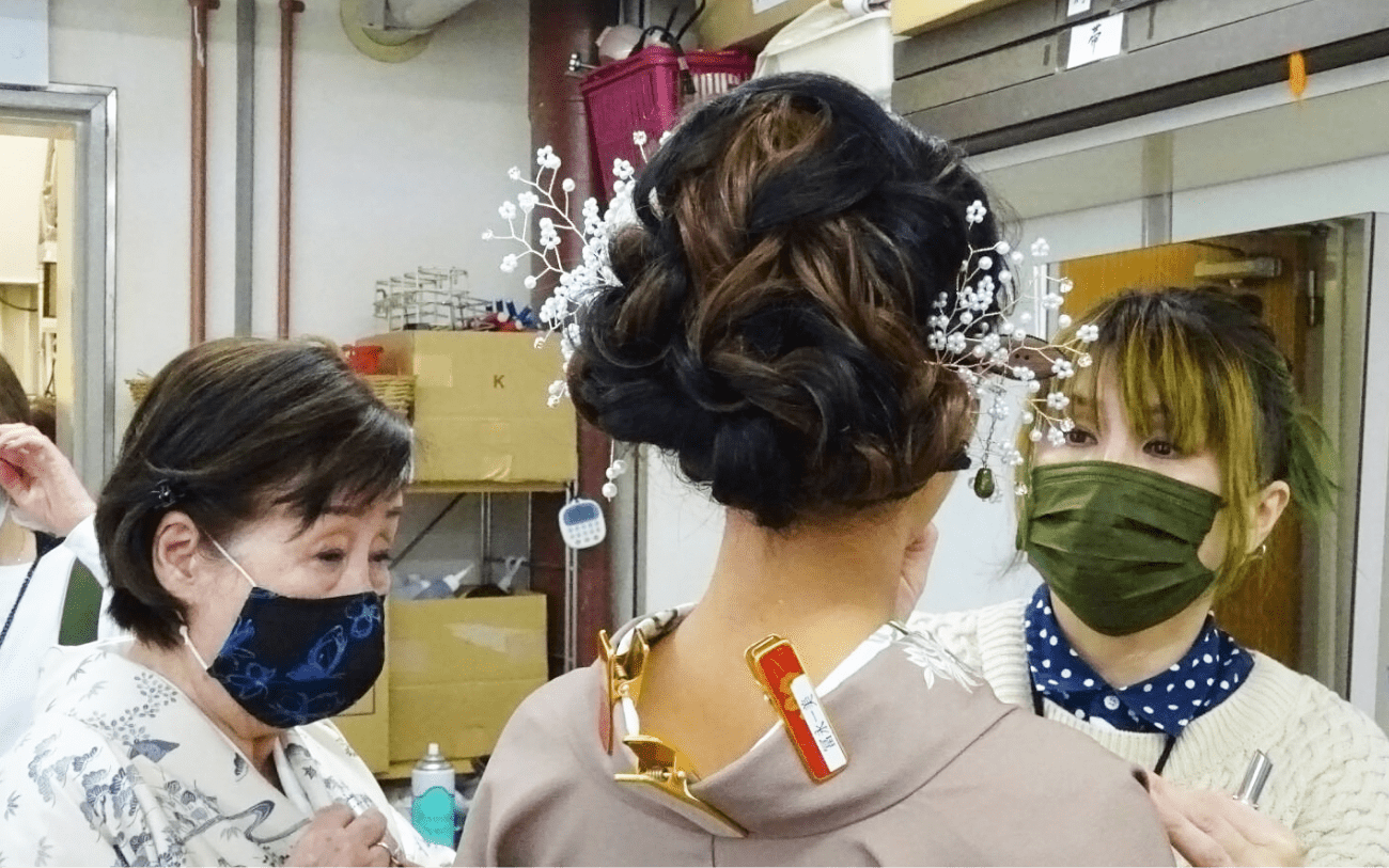 当会では、お付き合いのあるサロンや披露宴などで着付をしてもらいたいホテルなどから着付要員の相談をいただきます。その際、近隣会員にお声がけし、お仕事として紹介しています。