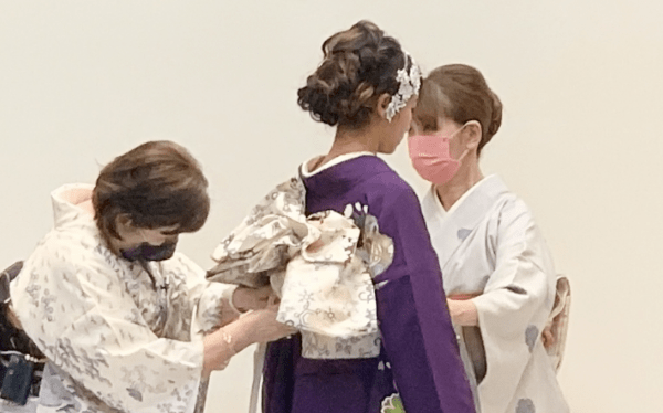 美容師になってまだ見習いの頃に、とある着付け教室に通い研究科まで受講してたのですが、腰ベルトに後輪ベルト2本づかいの、なんとか着せれるという状態でした。小松先生の展示講習を受けて、華やかな帯揚げや可愛い重ね帯板に憧れてどんな風にされてるか知りたくて、娘の成人式の着付けに取り入れたくて、受講したのがきっかけでした。でも、いざ、参加すると、未経験といってもいいぐらい未熟さが分かり、一からのスタートでした。後輪ベルトを使わず、腰紐のみで着付けていくのも、おはしよりの処理も、みやつくちの処理も、今までの着付けがどれほどいいかげんだったのかが、分かりました。小松先生に厳しく注意されるのを恐れて講習に参加する道中も動画を見ながら、手順や先生の手つきを覚えようと必死でした。 まだまだ、着付けに時間もかかりますし、基本的なお着物の教学も知らない事ばかりですが、確実に成長していると思います。